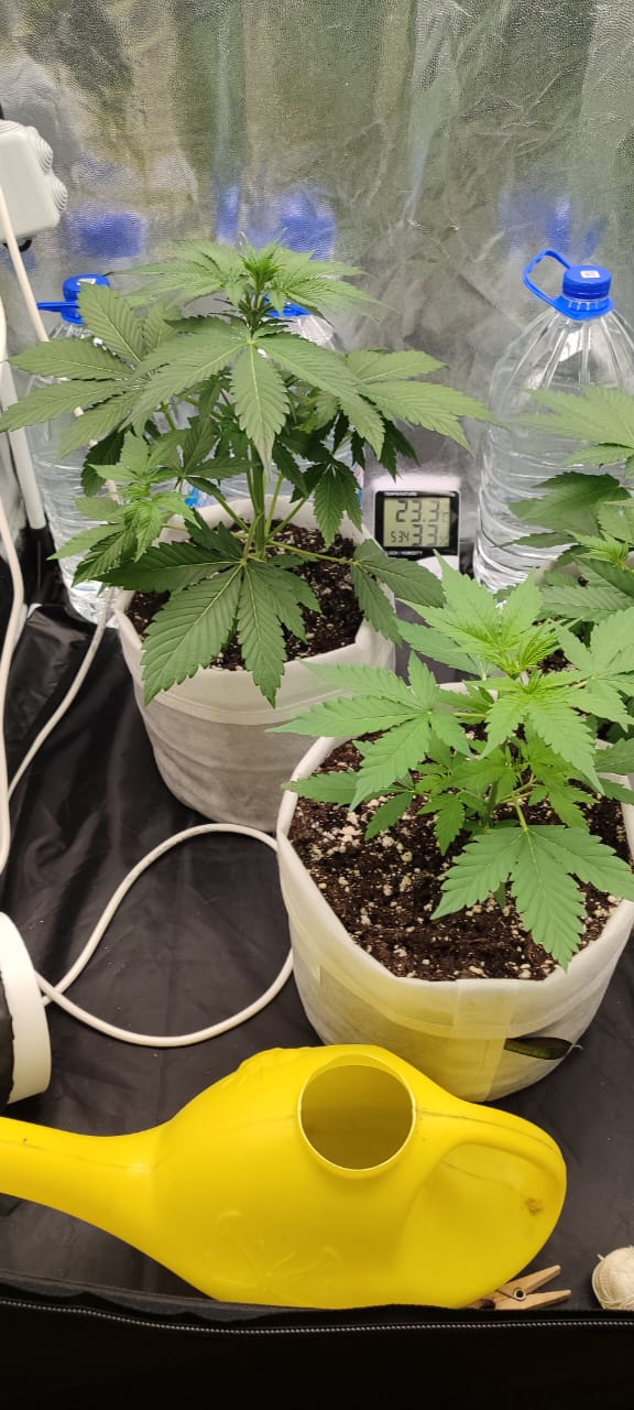 Замачил в ватных дисках 2 семечки,2 ждут выезда в аутдор по сезону.Через 2 дня появился корешок,высадил сразу в два мешка ,земли 9 литров.В течение 3х дней появилась жизнь! 🙂 На фото 28 дней от прорастания🥺.Полил гуматом для укрепления корней и роста,уехал на много,бате сказал,поливай дважды в неделю,лампа на 160вт🤫Ближний мешок,там подарочная мороженка гелатто🤭,ох и намучился с ней,с трудностями мы пробивались в жызнь😌,25 дней примерно ей.Генетика понравилась,отличный Сид бак